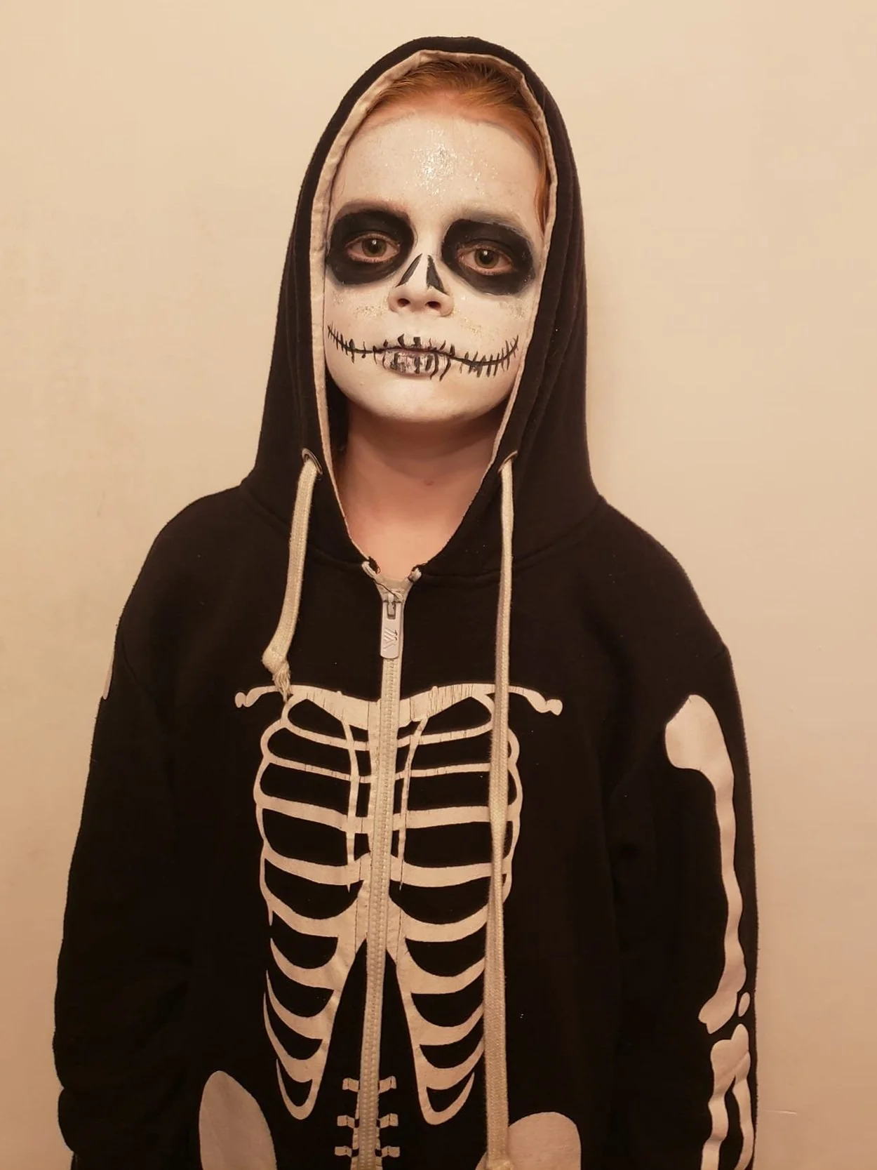 Person in skeleton costume with face painted like a skull, wearing a black hoodie with skeleton design.