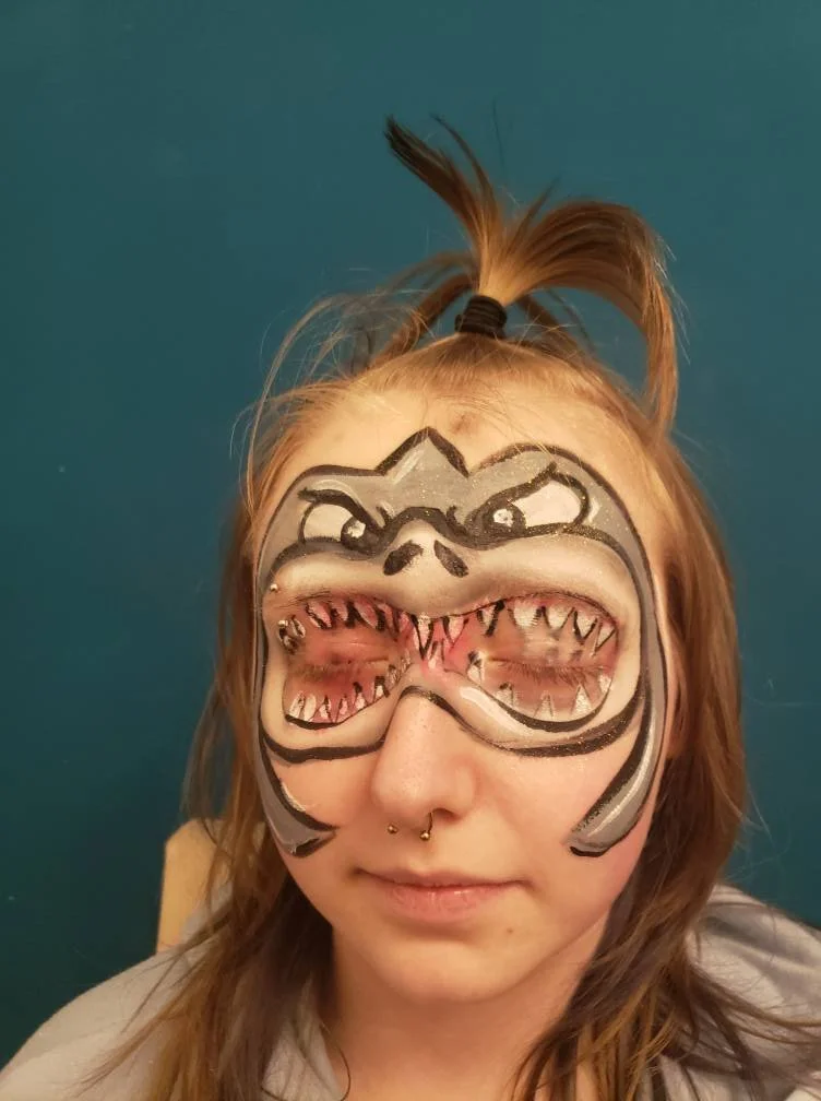 Person with artistic face paint resembling a shark's open mouth with sharp teeth on their eyes and nose area.